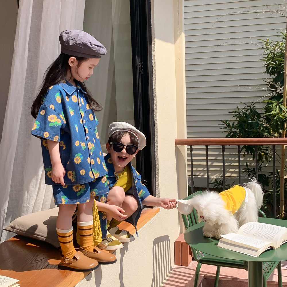 韓国風子供服 2024春夏 姉妹兄弟コーデ デニム 花柄 上下セット トップス シャツ+ズボン 90-150cm