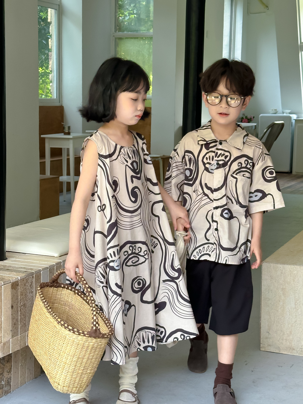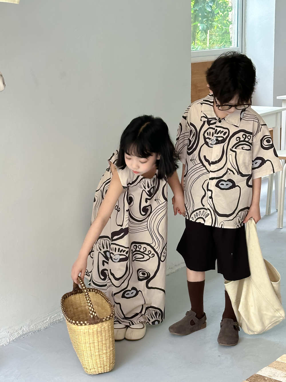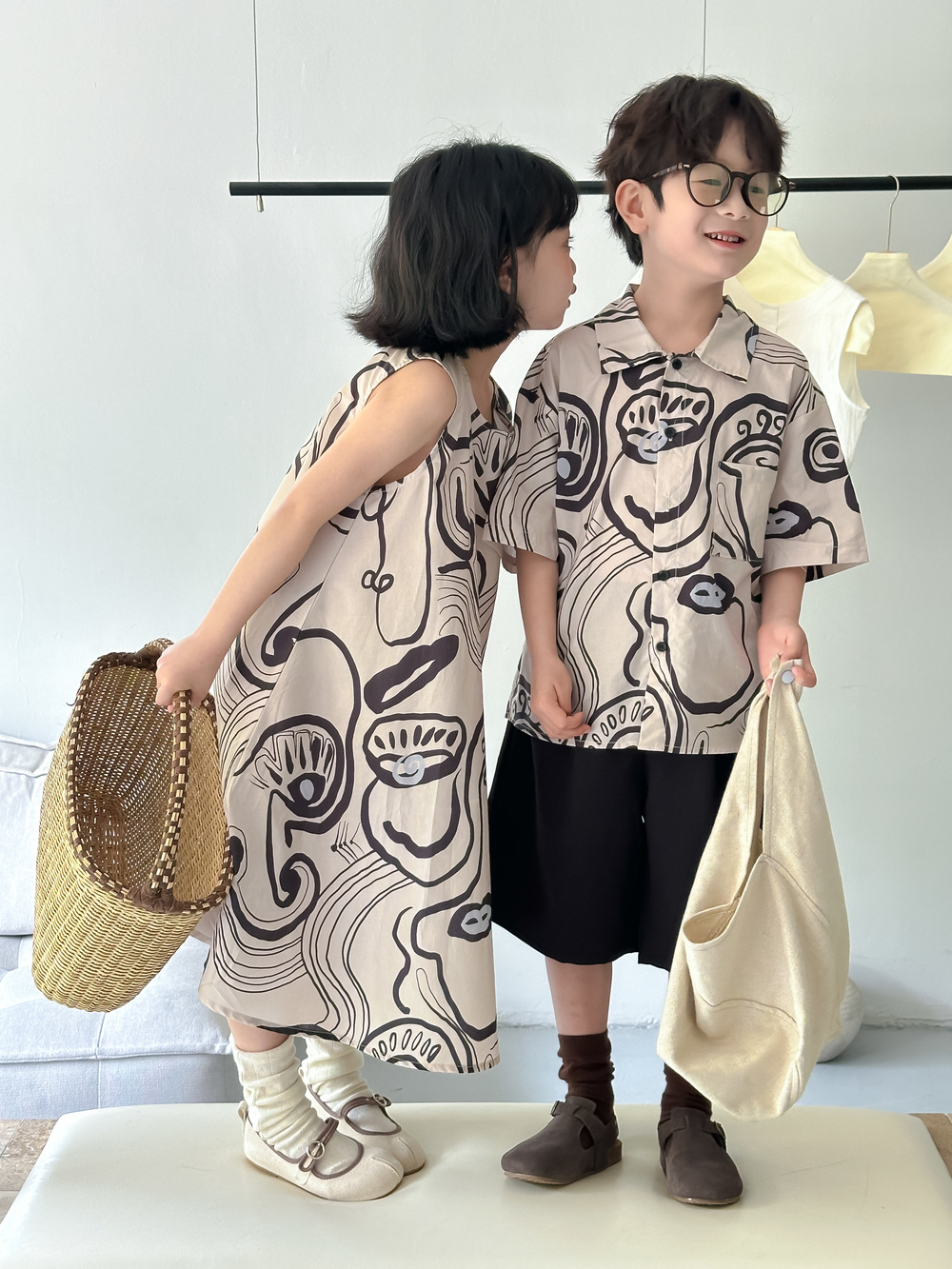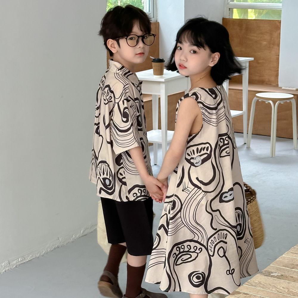 韓国風子供服 プリント 2024春夏 姉妹兄弟コーデ ワンピース&シャツ上着 トップス 半袖 90-150cm