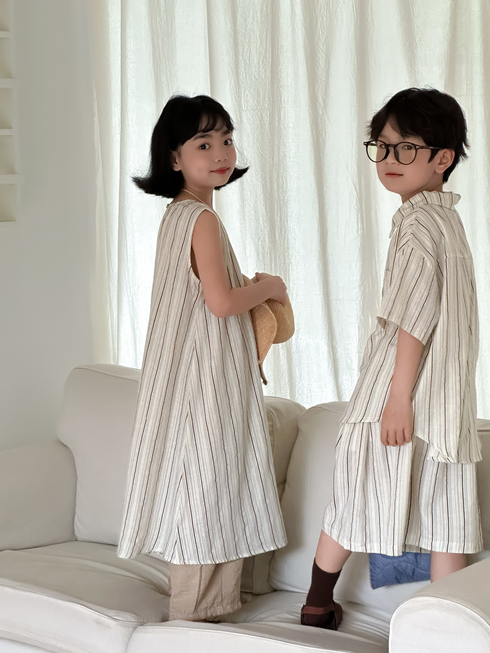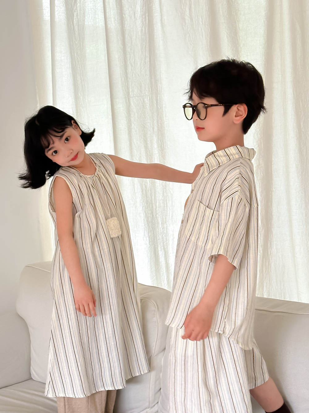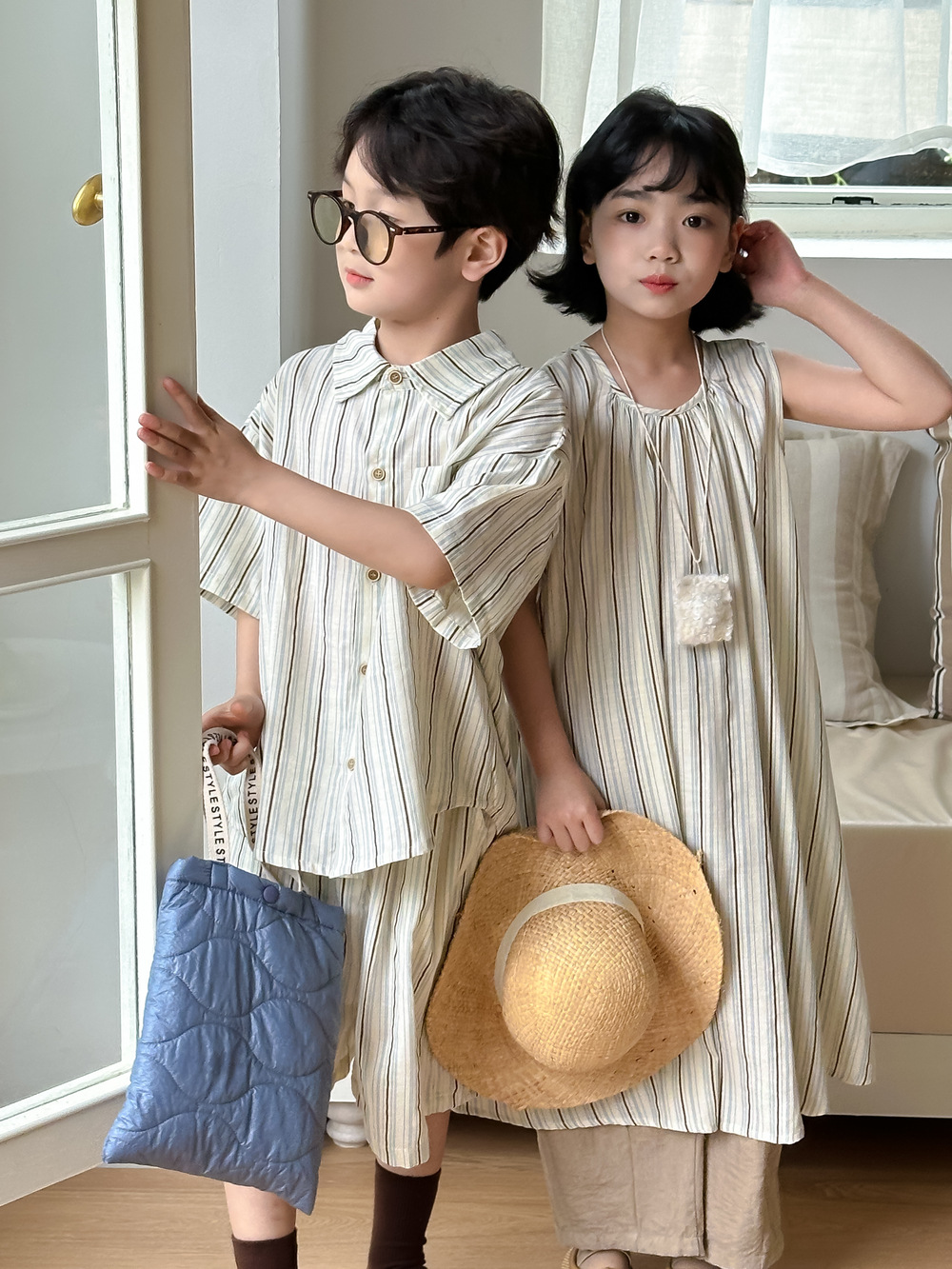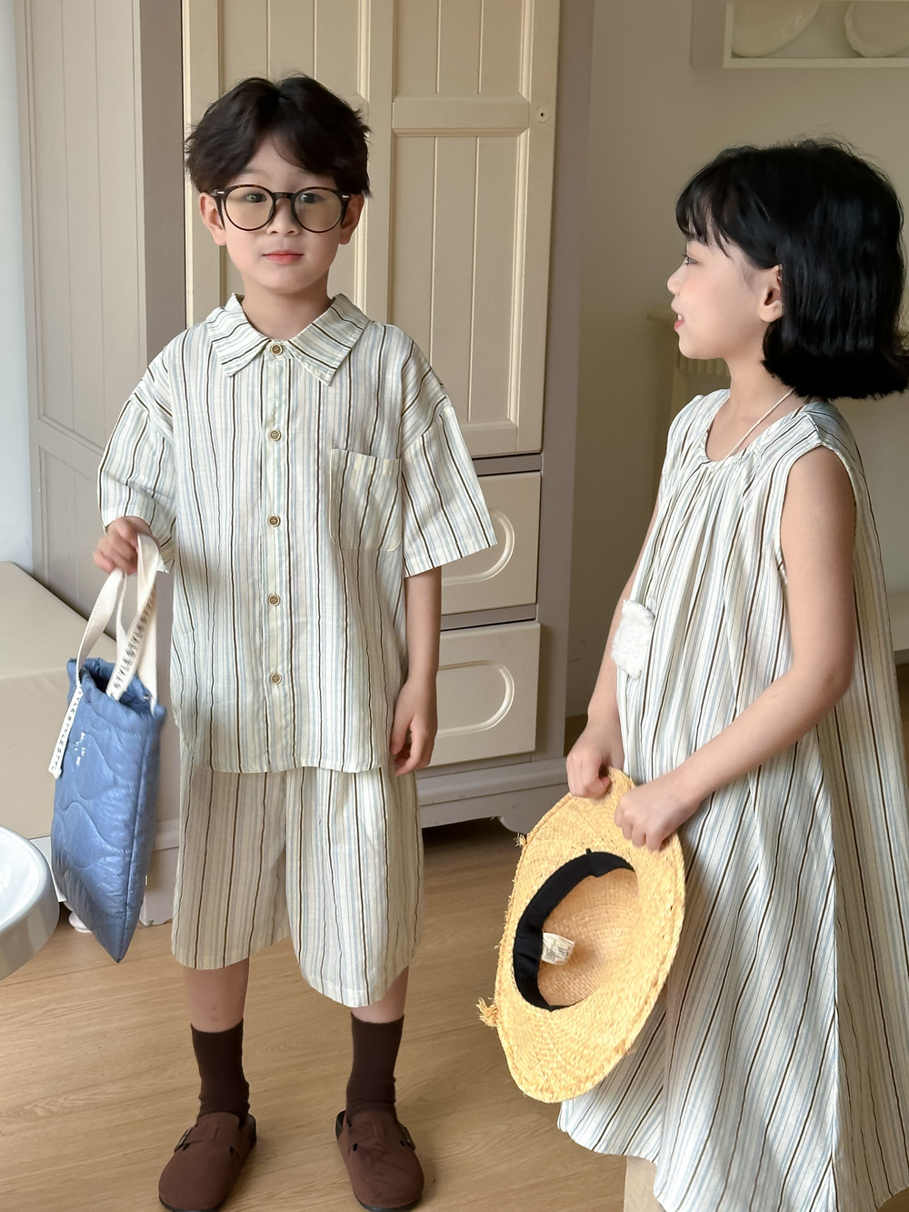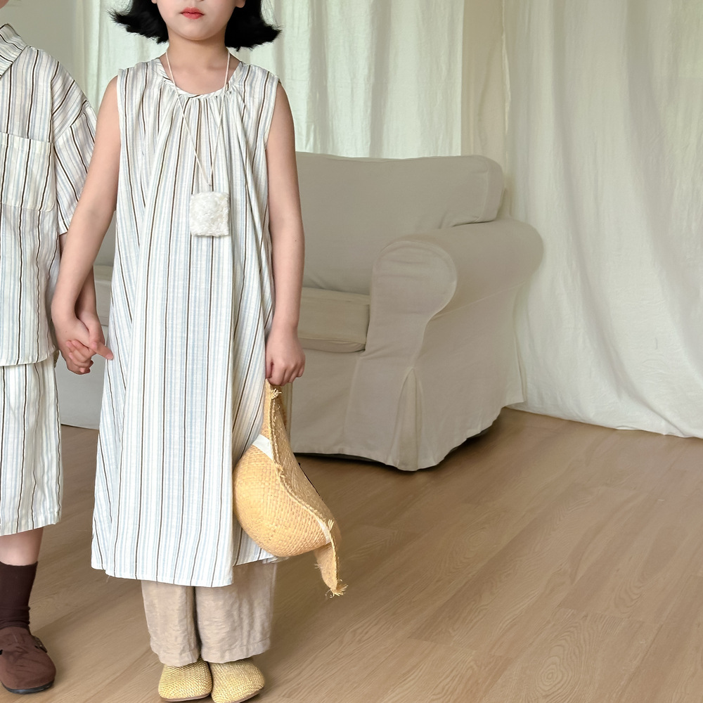 韓国風子供服 ストライプ柄 2024春夏 姉妹兄弟コーデ ワンピース&Tシャツ上着 トップス 半袖 90-150cm