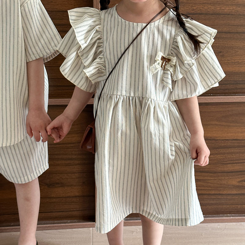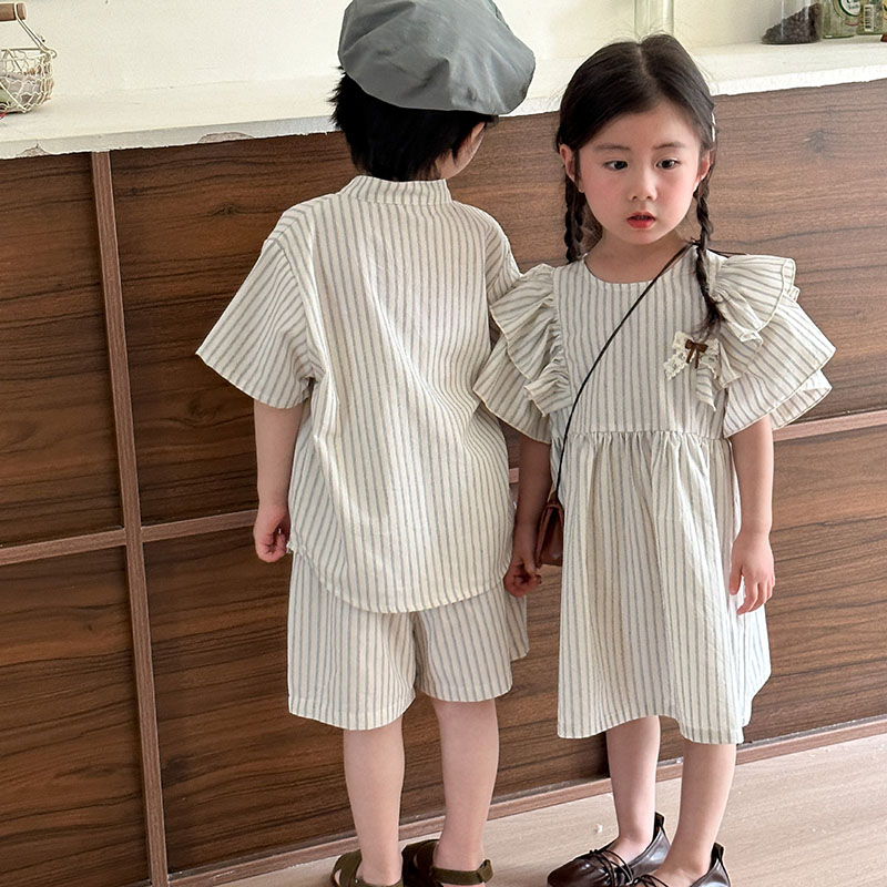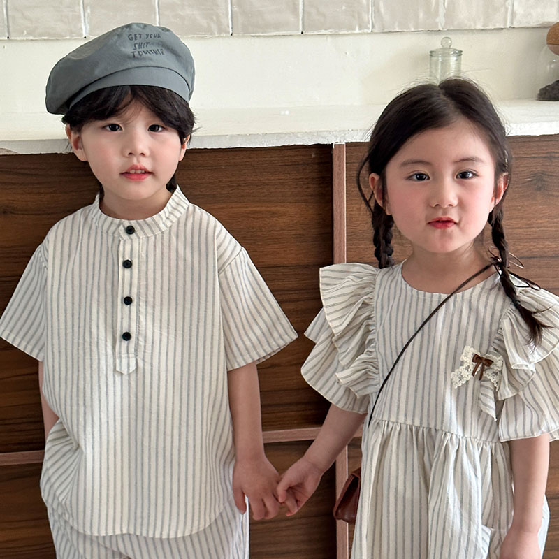 韓国風子供服 2024春夏 姉妹兄弟コーデ ストライプ柄 ワンピース&上下セット トップス+ズボン 80-150