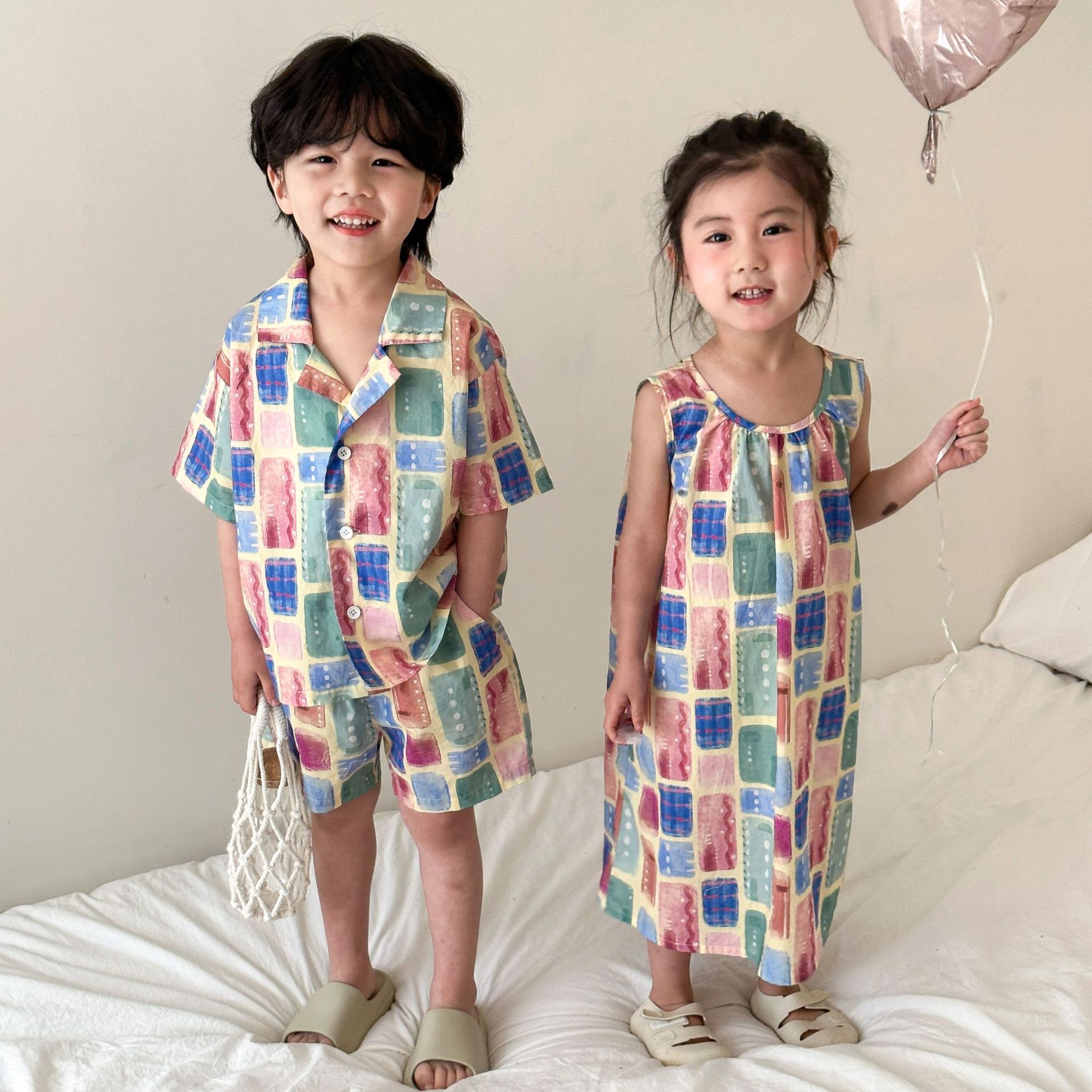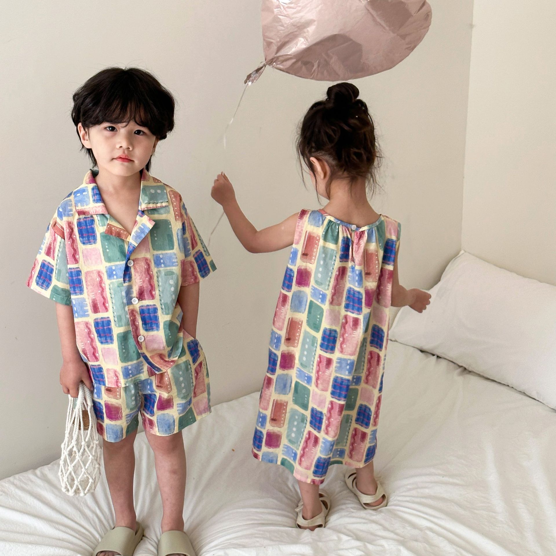 韓国風子供服 2024春夏 姉妹兄弟コーデ チェック柄 ワンピース&上下セット トップス+ズボン 80-150cm