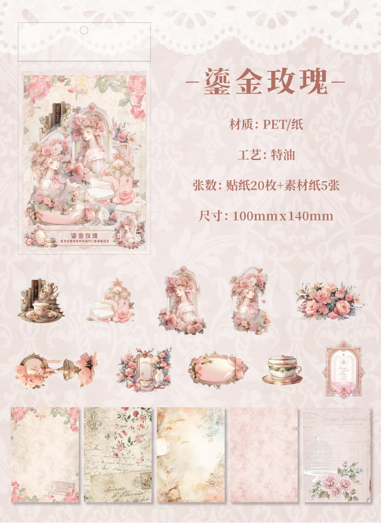 カフェ風 PETステッカー アンティーク ガール少女 窓 花フラワー イラスト シール20枚+素材紙5枚